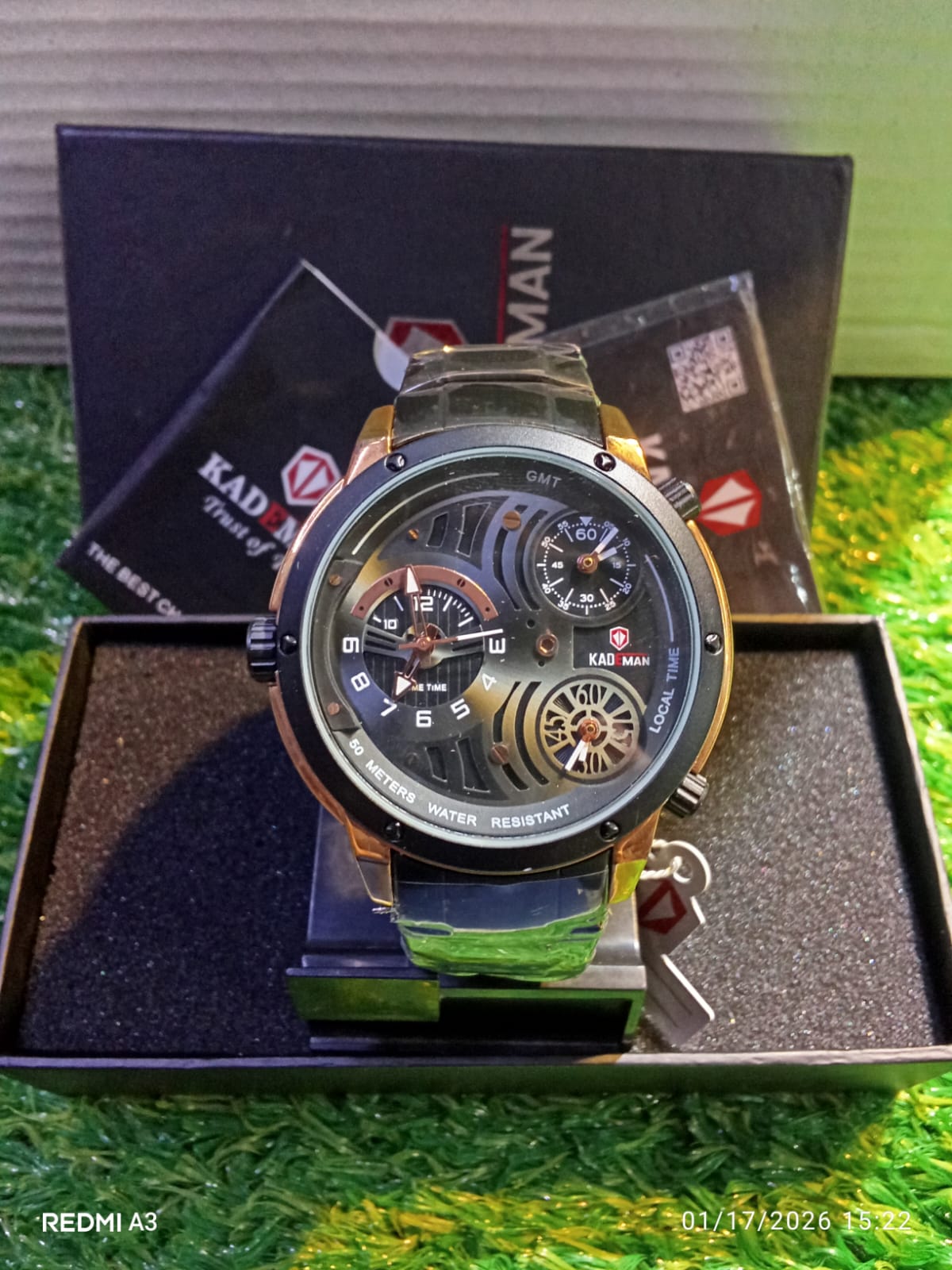 The dial is masterfully engineered with a complex, multi-dimensional layout. It includes a dedicated “Local Time” sub-dial and a “GMT” display, allowing you to track two time zones simultaneously with ease. Encased in a robust 50M water-resistant frame and featuring a textured industrial crown, this Kademan timepiece is built for the man who appreciates both high-fashion and extreme functionality. Whether it’s a business trip or a luxury event, this watch ensures you stay ahead of the curve.