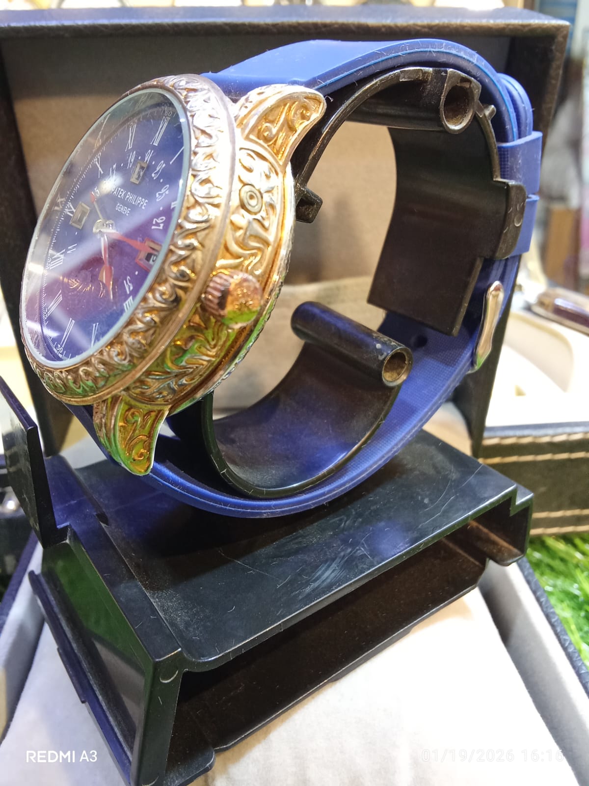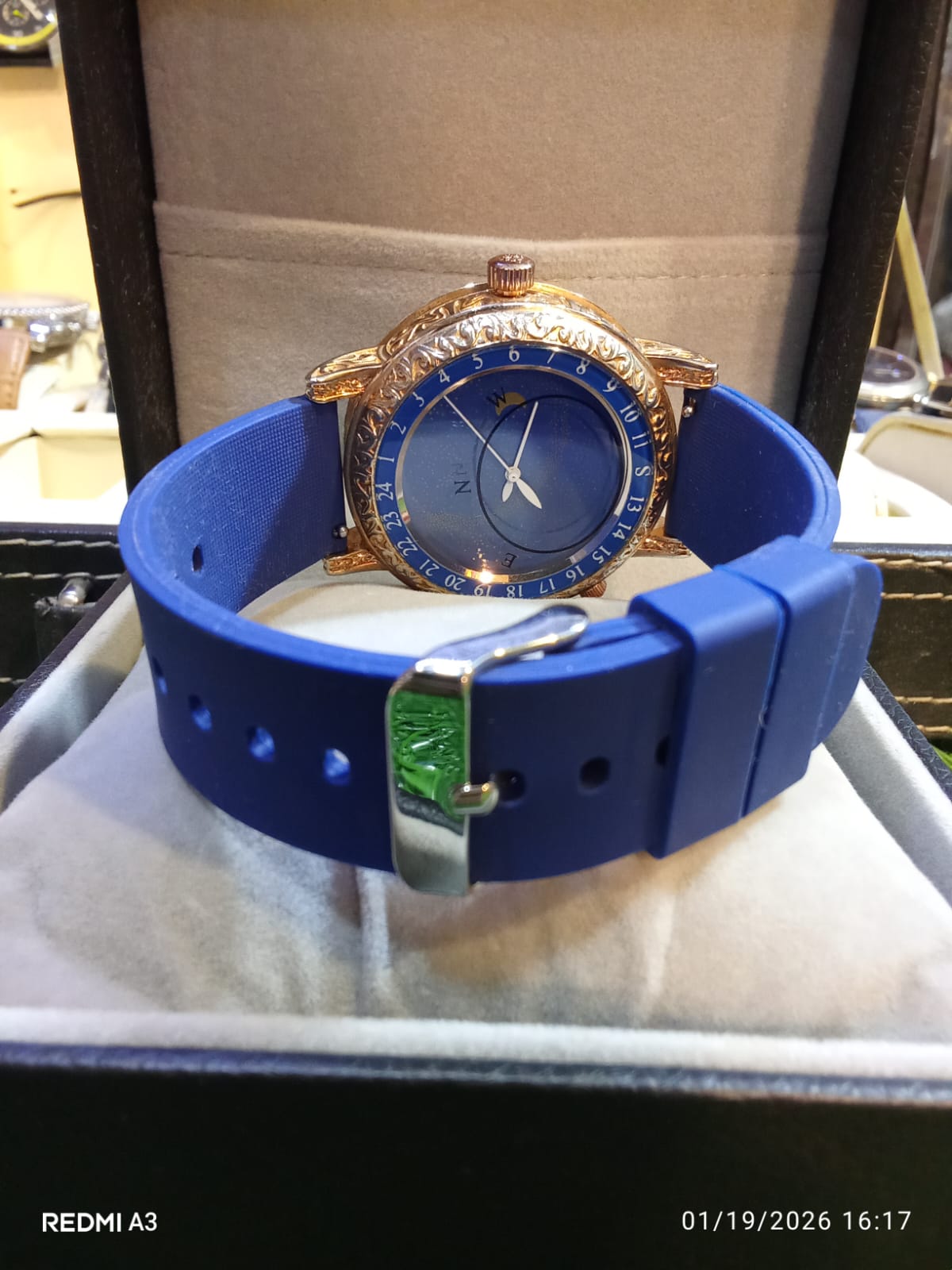 Encasing the dial is a round gold-tone case with intricate engraved detailing along the bezel and lugs, enhancing the watch’s ornamental appeal. The timepiece is paired with a blue strap that complements the dial and reinforces its elegant, feminine character. A ridged crown completes the refined profile.