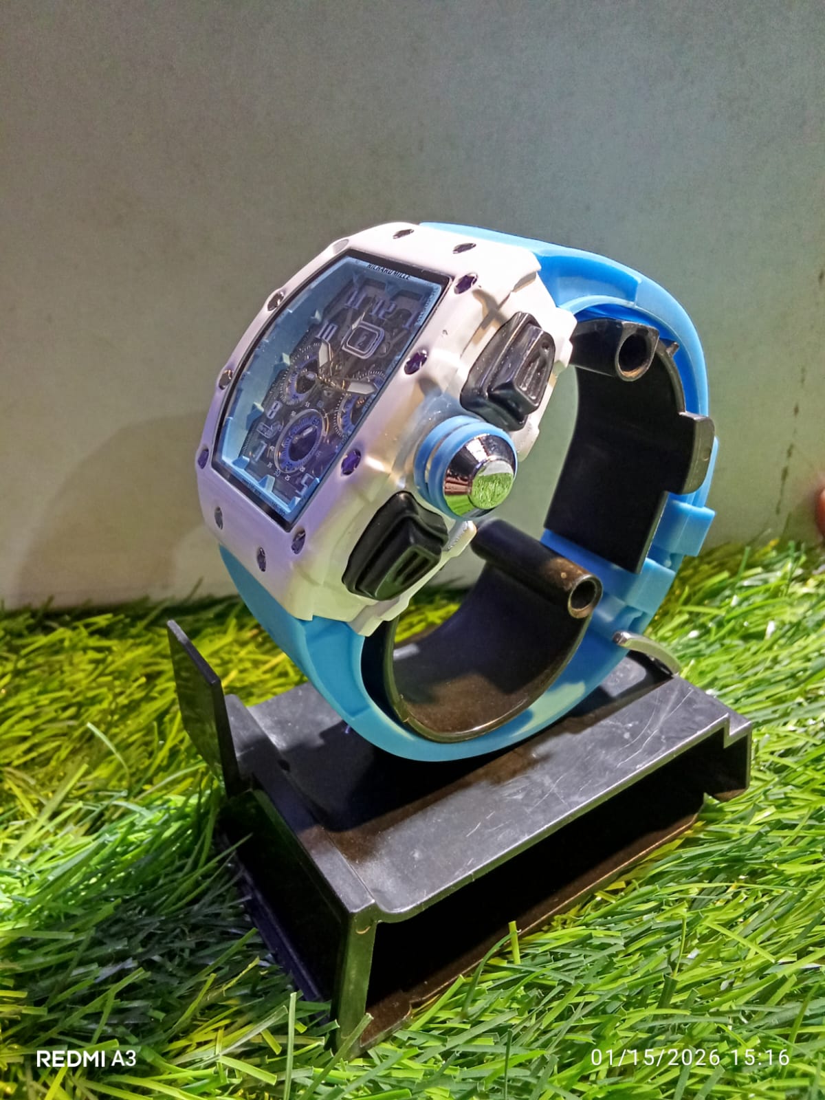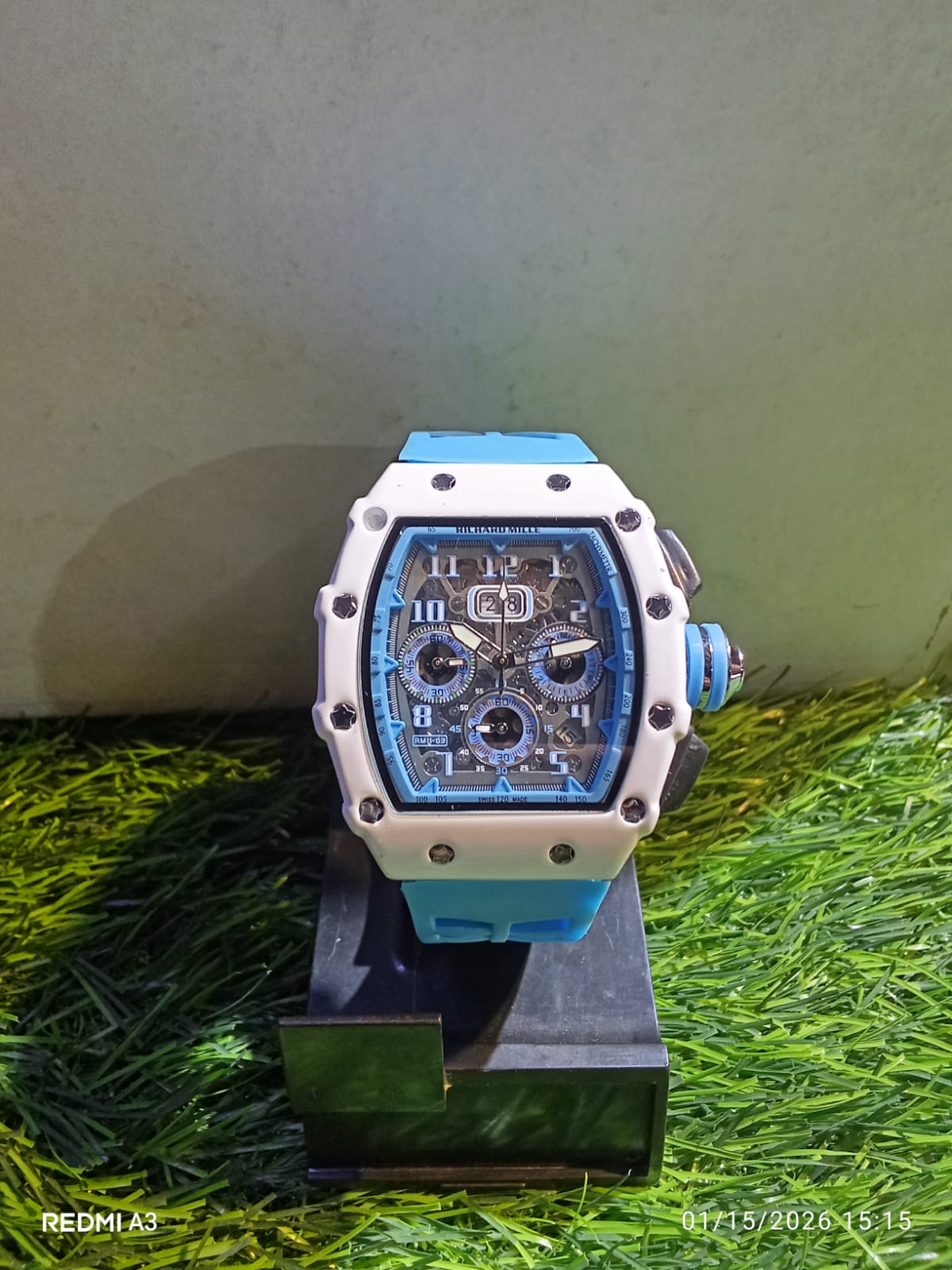 Stand out from the crowd with the RM-Inspired Arctic Sky Edition. Designed for those who appreciate bold colors and avant-garde luxury, this watch combines a striking white casing with electric light blue details. The unique barrel-shaped “Tonneau” design provides a commanding presence on the wrist while maintaining a sporty, lightweight feel.