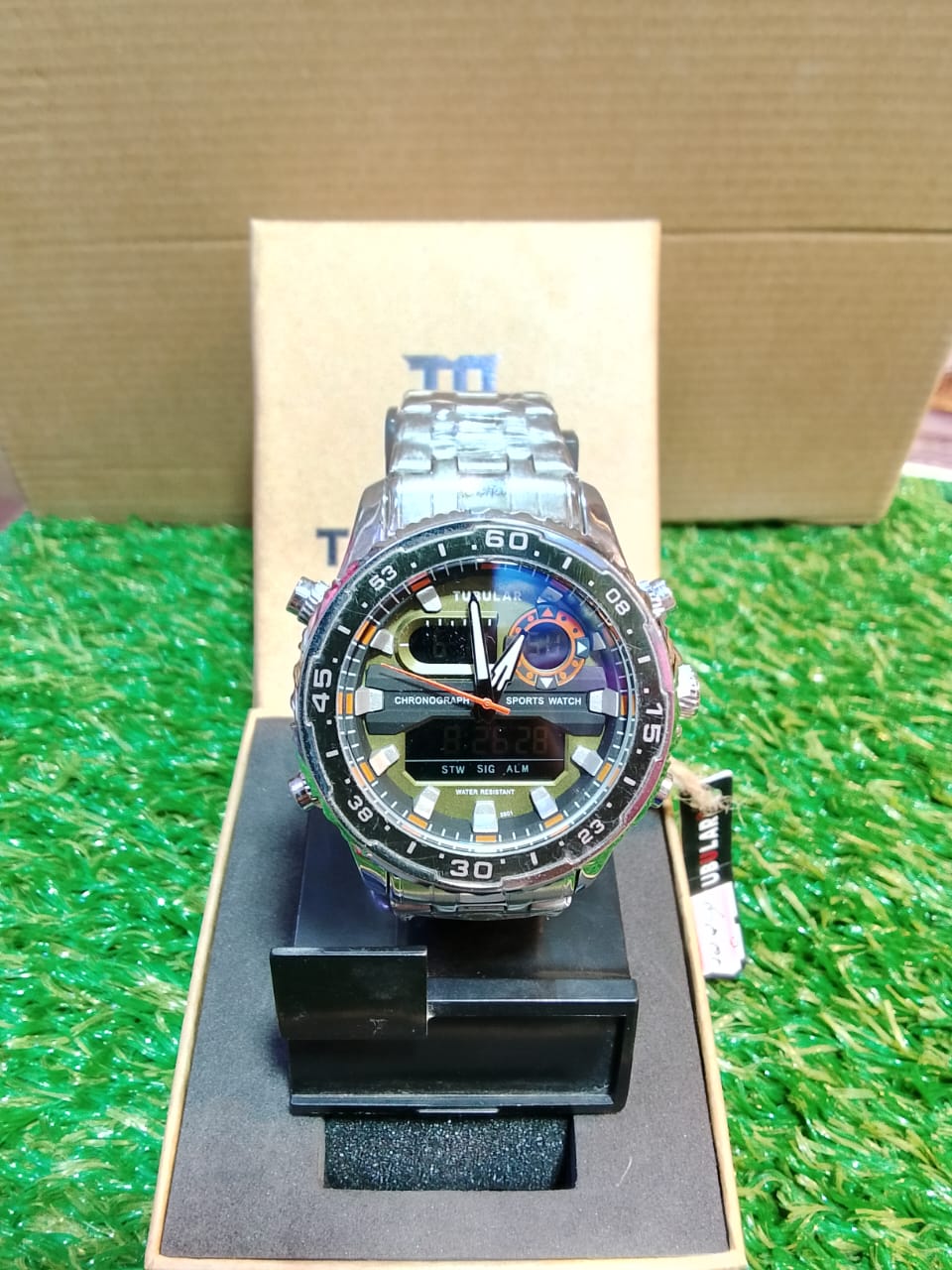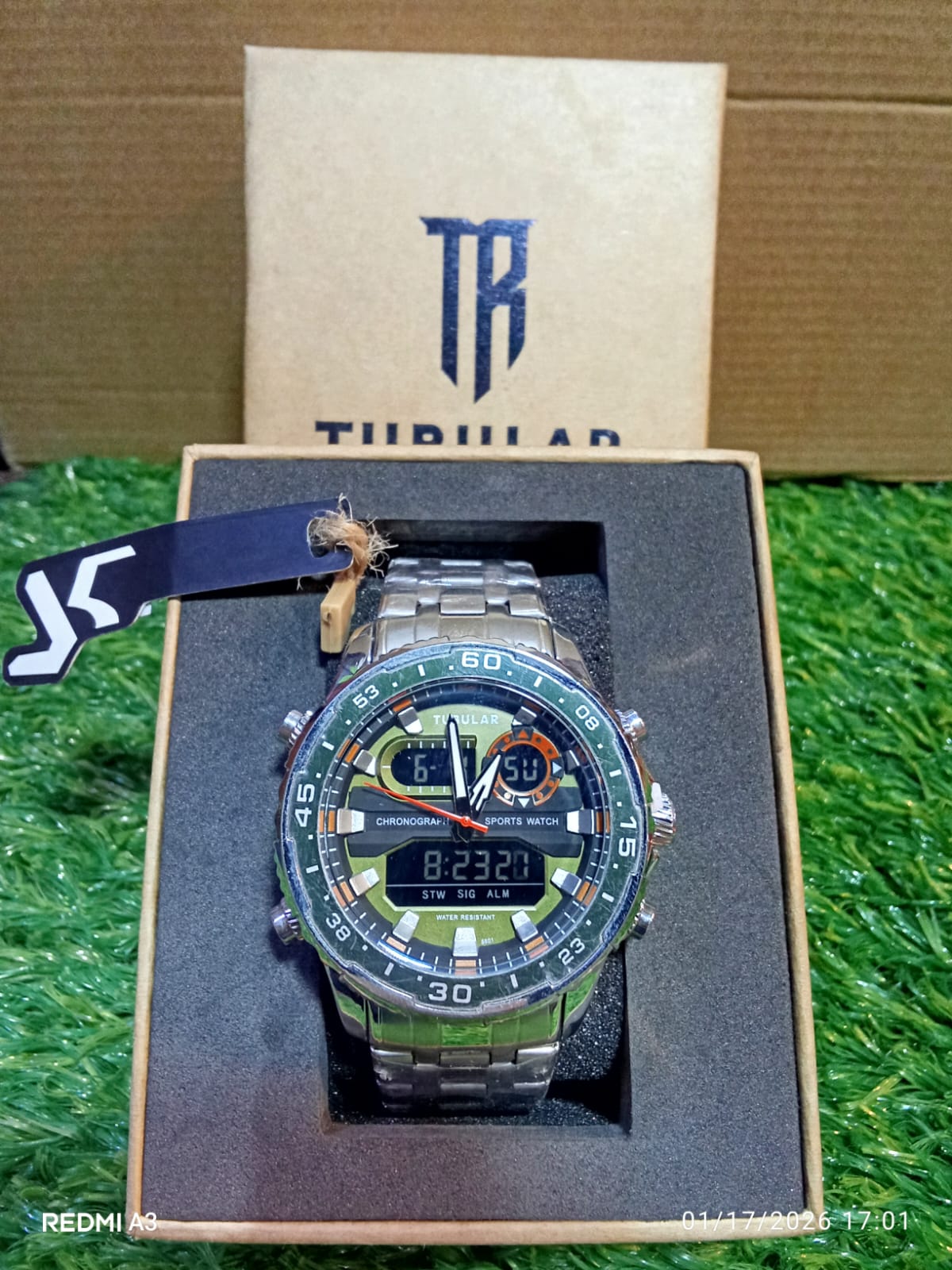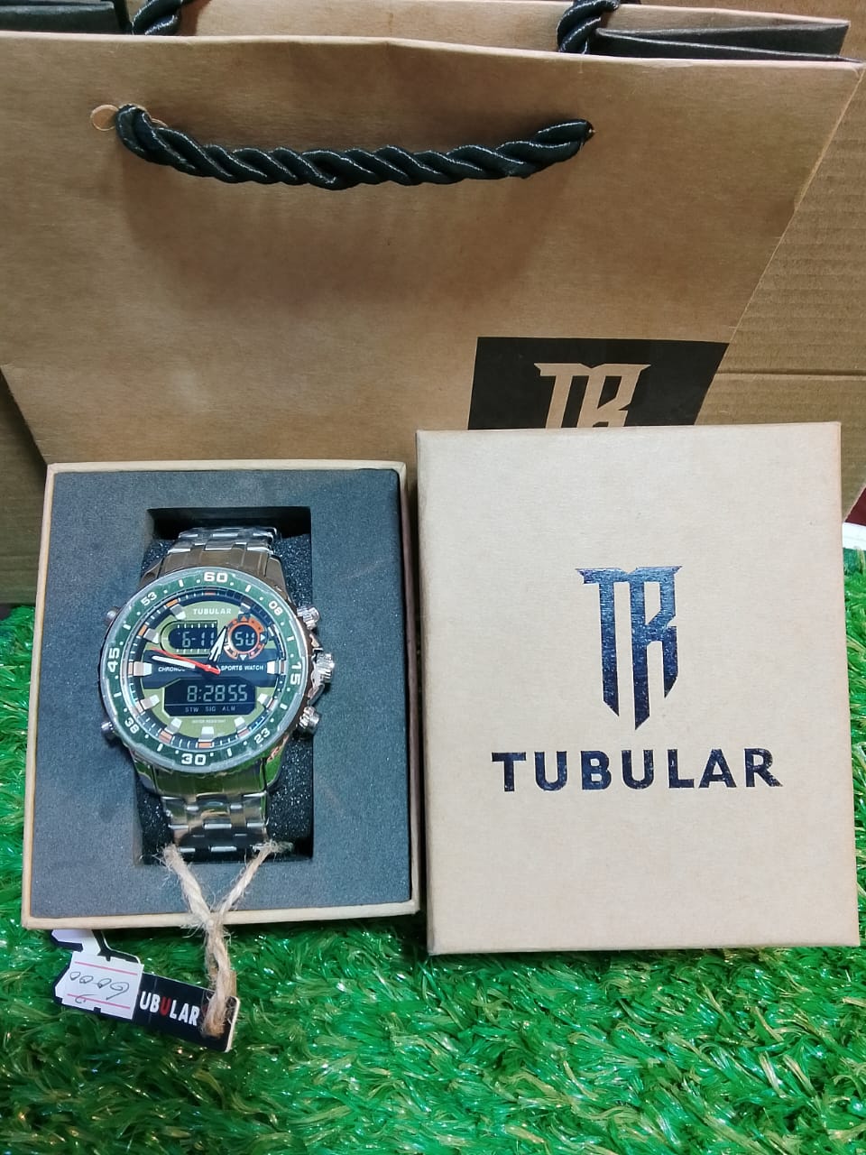 The watch features a high-contrast dial with military-grade styling. Whether you are heading to the gym, the office, or an outdoor trek, its sturdy construction ensures it stays reliable. The metal link bracelet provides a secure and comfortable fit, while the dual-display allows you to track multiple time zones or use the stopwatch and alarm functions with ease. Delivered in a signature Tubular eco-friendly box, it also makes for a perfect gift.