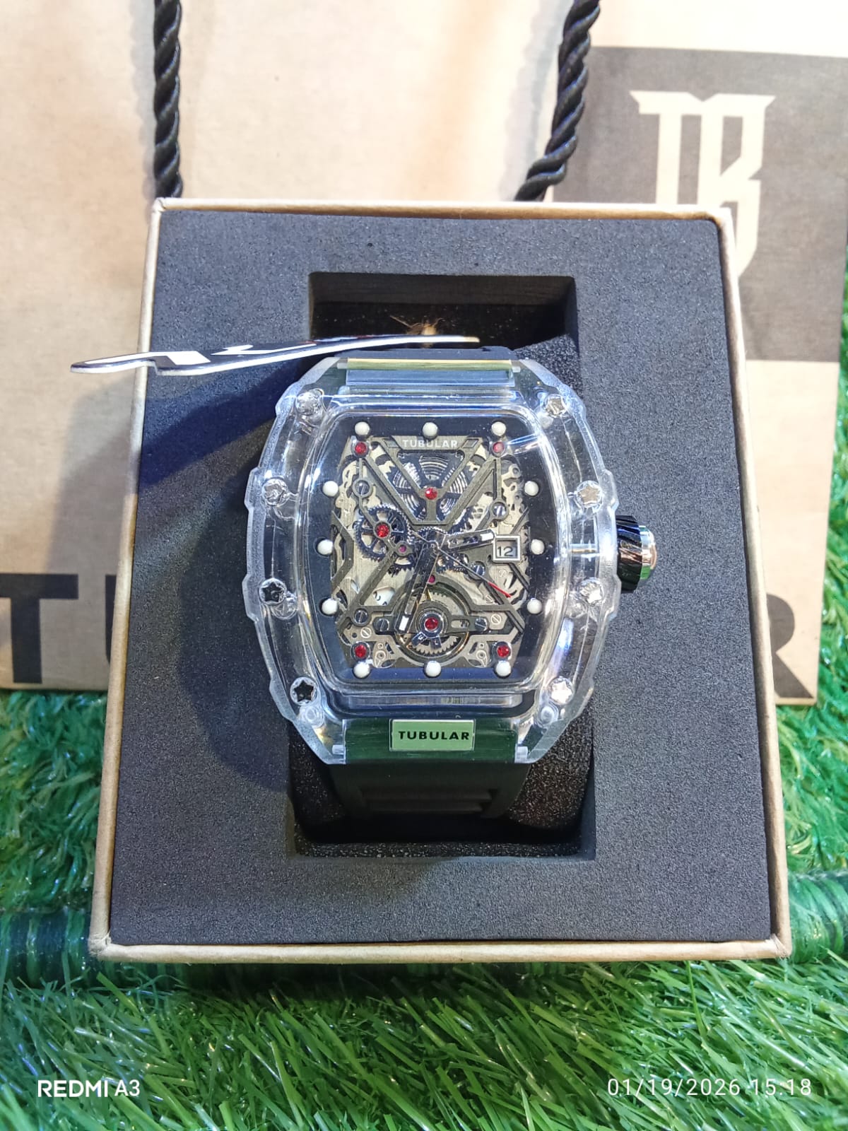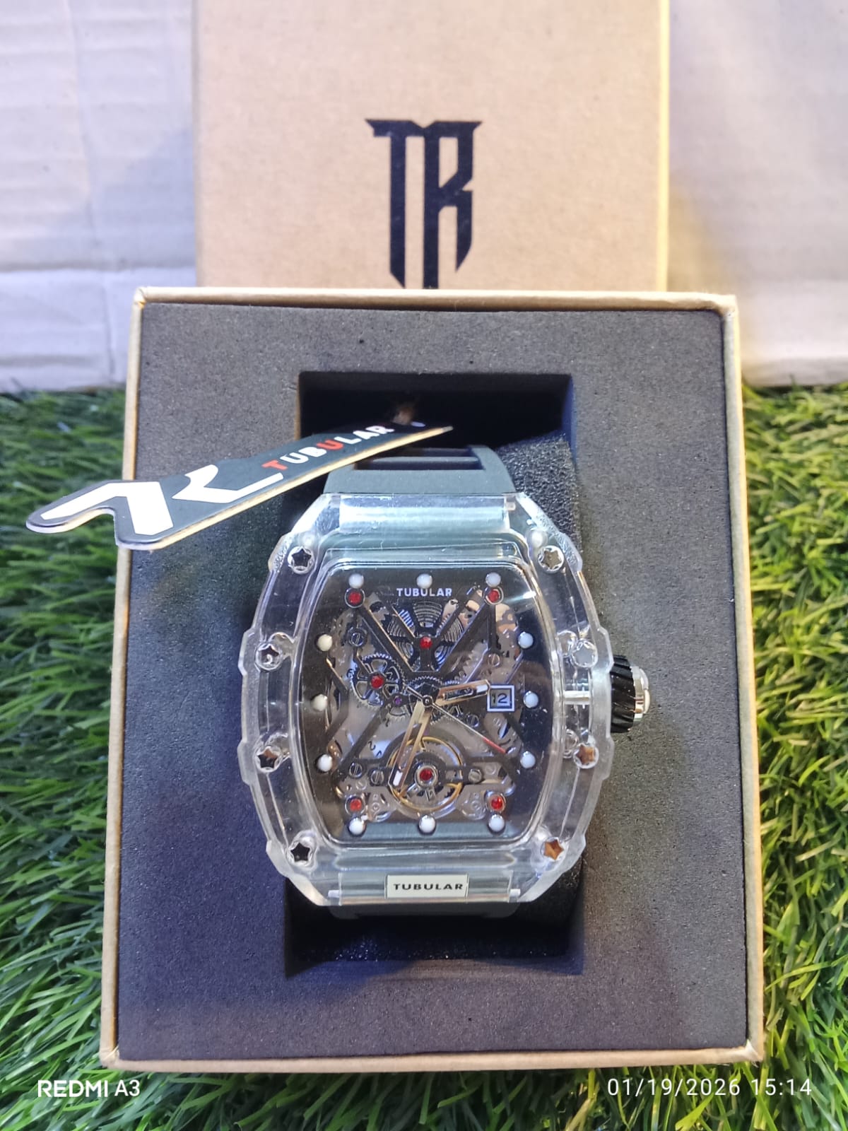 This bold and contemporary Tubular skeleton-style watch is designed to make a strong visual statement with its fully transparent dial construction and modern square case profile. The open-worked dial reveals intricate internal components, creating a mechanical-inspired aesthetic that highlights depth, symmetry, and precision detailing.